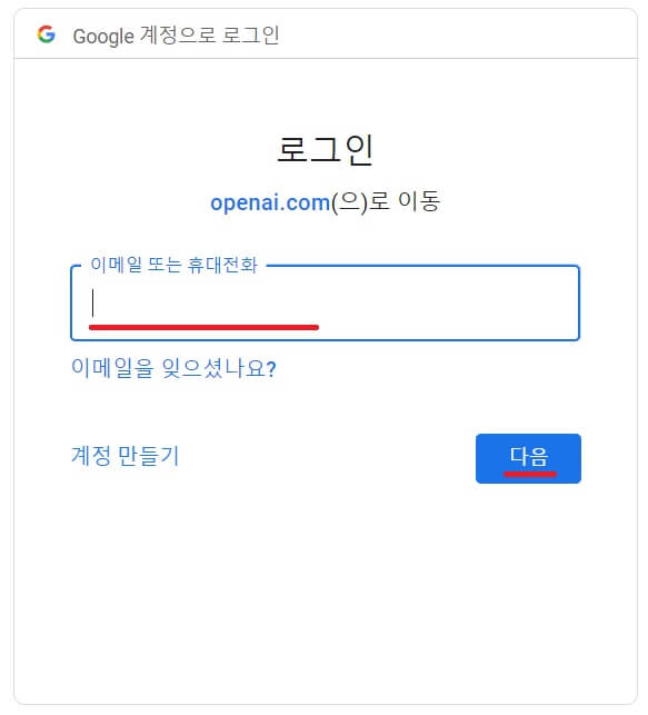 '이메일' 또는 '휴대전화'를 입력해 주시고 '다음'을 눌러주세요.