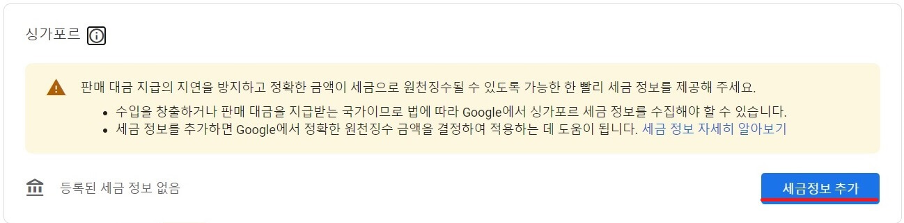 이번엔 '싱가포르'의 '세금정보 추가'를 하실 차례입니다. 훨씬 간단하니 걱정 마세요~