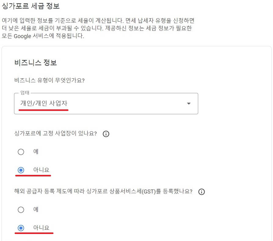 애드센스 싱가포르 세금 설정