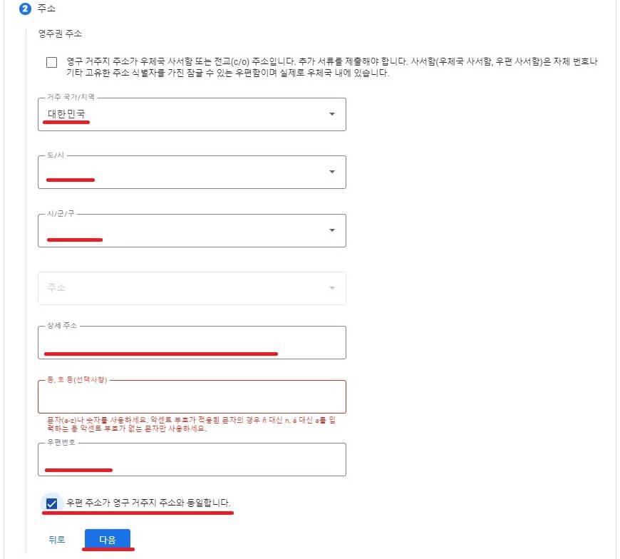 아 바로 위에 '우편 주소가 영구 거주지 주소와 동일합니다.' 체크박스 체크하셔야 합니다.