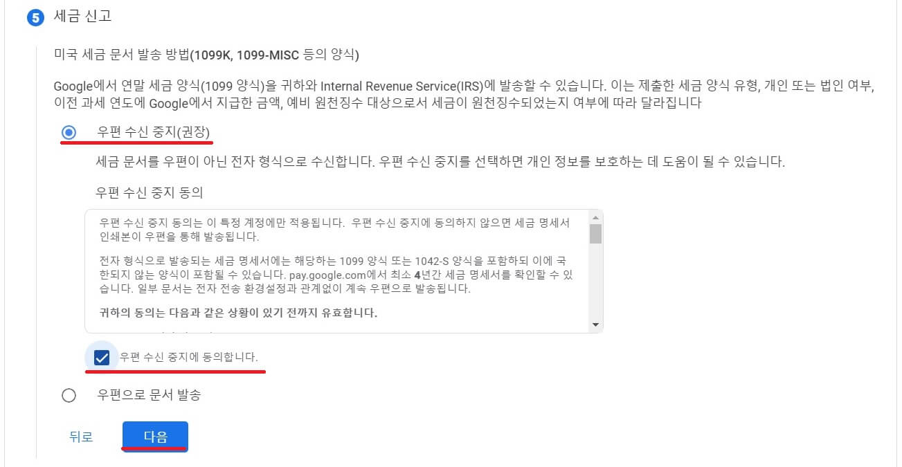 다음 항목에선 '우편 수신 중지(권장)'을 선택해 주시고요.
