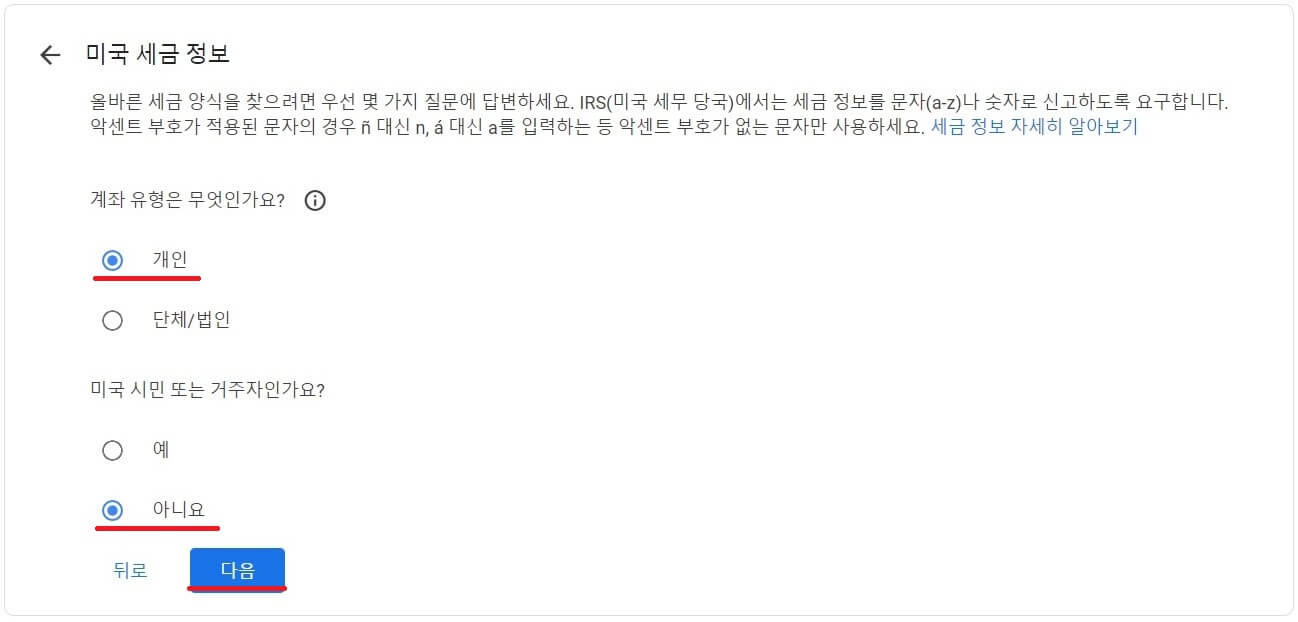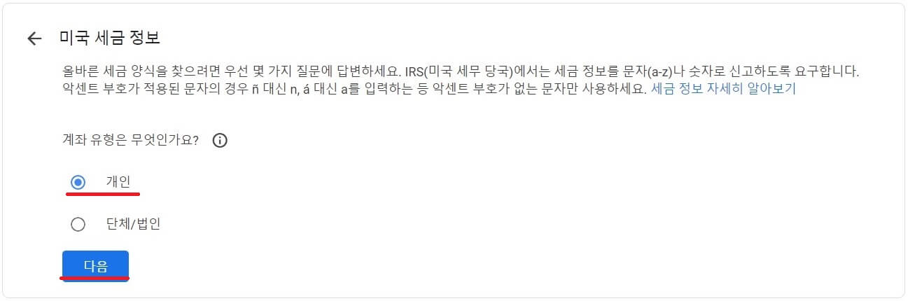 대부분 '개인'이실 테니 맞는 선택을 하시고 '다음' 해주세요.
