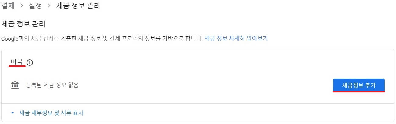 상단의 세금정보관리에서 '미국'의 '세금정보 추가'를 눌러주세요.