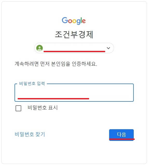 개인의 'ID'와 '비밀번호'로 로그인 '다음' 눌러주세요.