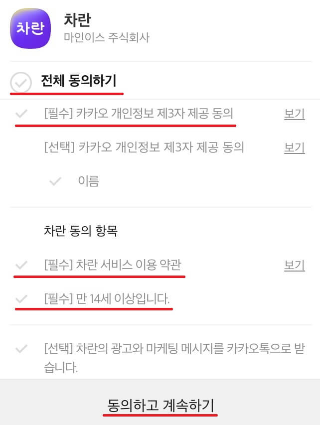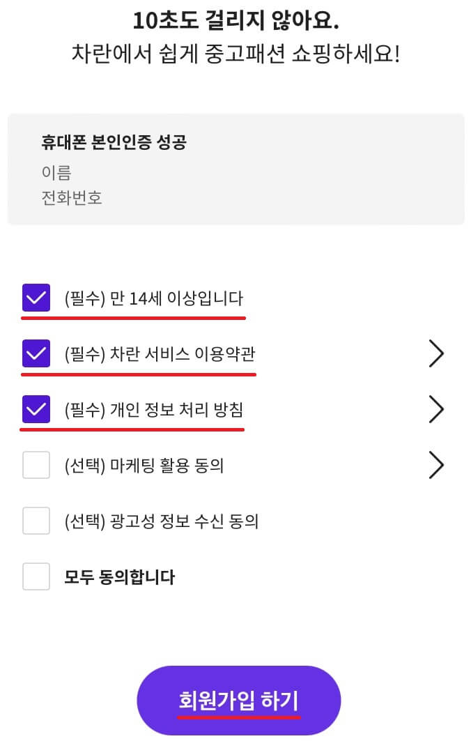 이번에도 '모두 동의합니다' 해주셔도 되지만, '필수' 항목만 체크했습니다.