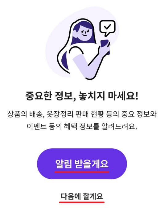 이번엔 '알림 받을게요'와 '다음에 할게요' 중에 선택하실 수 있습니다.