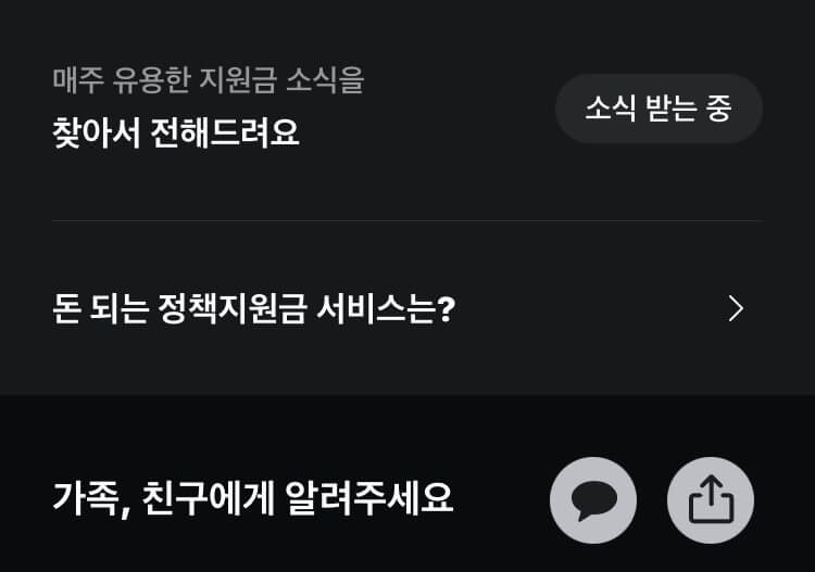 '돈 되는 정책지원금' 항목에서 스크롤을 거의 끝까지 내려가시면 '소식 받기'가 있습니다.