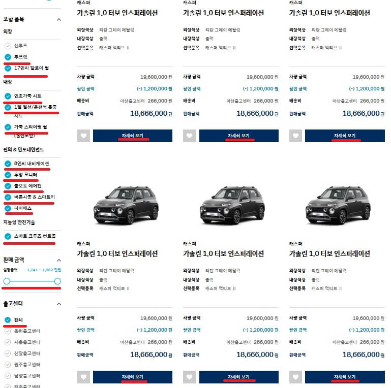선택된 옵션에 대한 차량이 우측에 검색됩니다. '자세히 보기' 눌러주시면 차량 정보도 나옵니다.